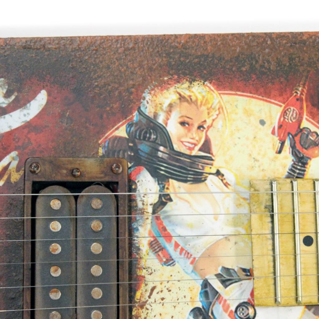CBG-Style guitar shape in Fallout paint style – Nuka Cola Red. Loaded with a Humbucker. Fan Art. Made for my personal collection. Inspired by the Video Game Fallout.